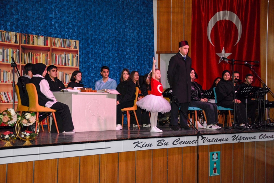 Okul Müdürü İsa Ünel günün anlam ve önemine dikkat çekerek yaptığı konuşmasında, “Bugün İstiklal Marşı’mızın kabulünün 102.yılını kutluyoruz. Vatan ve millet sevgisinin, bağımsızlık ve hürriyet aşkının en güzel ifadesi olan İstiklal Marşı’mızı, bize armağan eden milli şairimiz Mehmet Akif Ersoy’u saygı ve rahmetle anıyoruz. Bayrağımız ve onun hürriyetini ebedileştiren İstiklal Marşımız; milletimizin ruhunu, tarihini ve ideallerini aksettiren ölmez bir şaheserdir. İstiklâl Marşı’nı sevmek, ülkemizi sevmektir, coşkuyla söylemek ülkemize sahip çıkmaktır, vakur bir şekilde okumak bağımsızlığımıza sahip çıkmaktır. İstiklal Marşı’nı anlayabilmek için, Mehmet Akif’i iyi bilmek, onun bütün yönleriyle şahsında topladığı “Milli mücadele ruhunu” yakından tanımak, bu ruhu, hakkı ile hissetmek gerekir. Mehmet Akif milli bir şair, ideal bir öğretmen, branşına hâkim bir veteriner, cesur bir gazeteci, Kurtuluş Savaşı’nda iyi bir asker, Türk gencine ufuk çizen fikir adamı, bir politikacı, bir gönül insanı, hayatı vatan hasreti ile biten ve vefa beklediği gözlerden cefa çeken bir garipti. Yüce destanı yazan usta şairi ve bu destanı yazdıran sayısız kahramanı rahmetle anıyor ve şanlı bayrağımızın göklerde, İstiklal Marşı’mızın dillerde, vatan sevgisinin iman dolu göğsümüzde ebediyen var olmasını diliyorum” dedi.