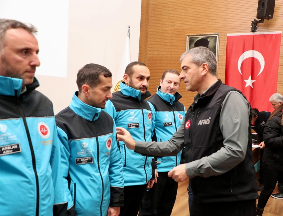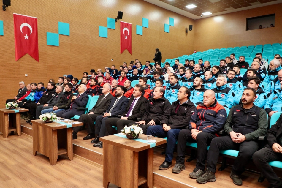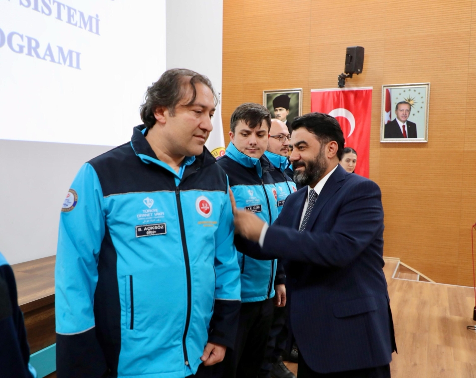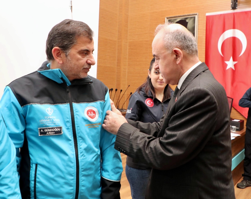 İl Afet ve Acil Durum Müdürü Ümit Ünal’ın konuşmasının ardından AFAD Akreditasyon Sistemi kapsamında akredite olan Türkiye Diyanet Vakfı ve Yesevi Hareketi Derneği arama ve kurtarma ekiplerine armaları, Vali Muammer Erol, Afet ve Acil Durum Müdürü Ümit Ünal, İl Müftüsü Dr. İsmail Çiçek, PTT Başmüdürü Şinasi Duman, İl Ticaret Müdürü Şenel Çakır tarafından takdim edildi.