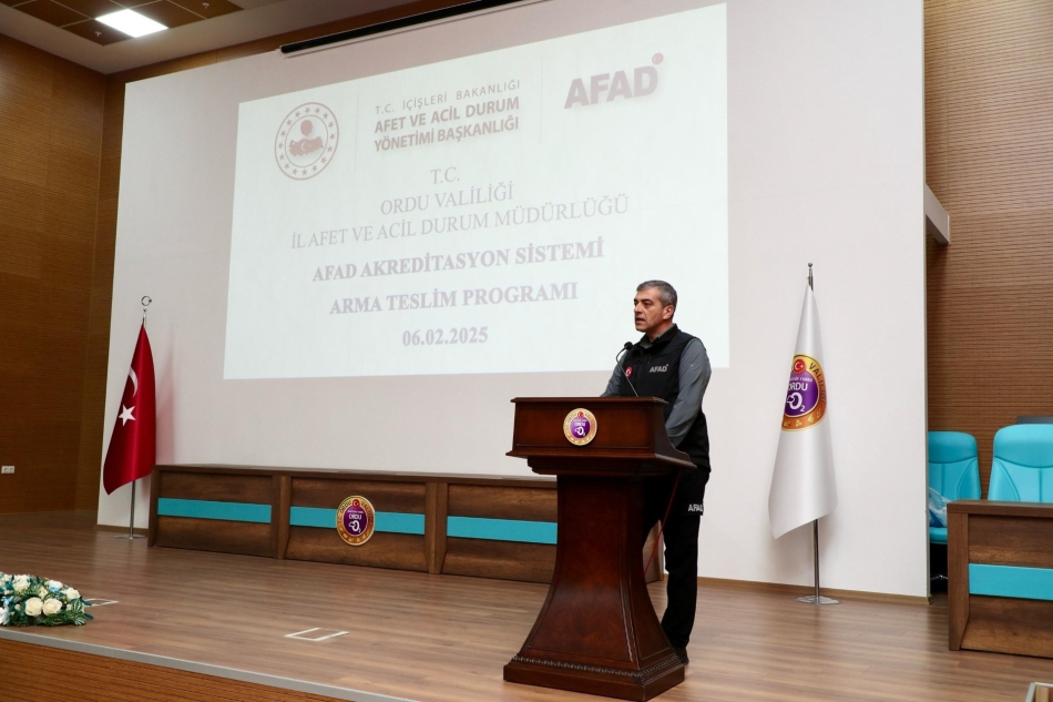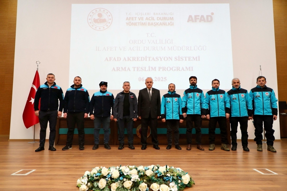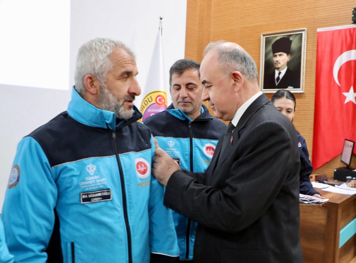 Ordu Valisi Muammer Erol, AFAD Akreditasyon Sistemi kapsamında akredite olan Türkiye Diyanet Vakfı ve Yesevi Hareketi Derneği arama ve kurtarma ekiplerinin arma teslim programına katıldı.