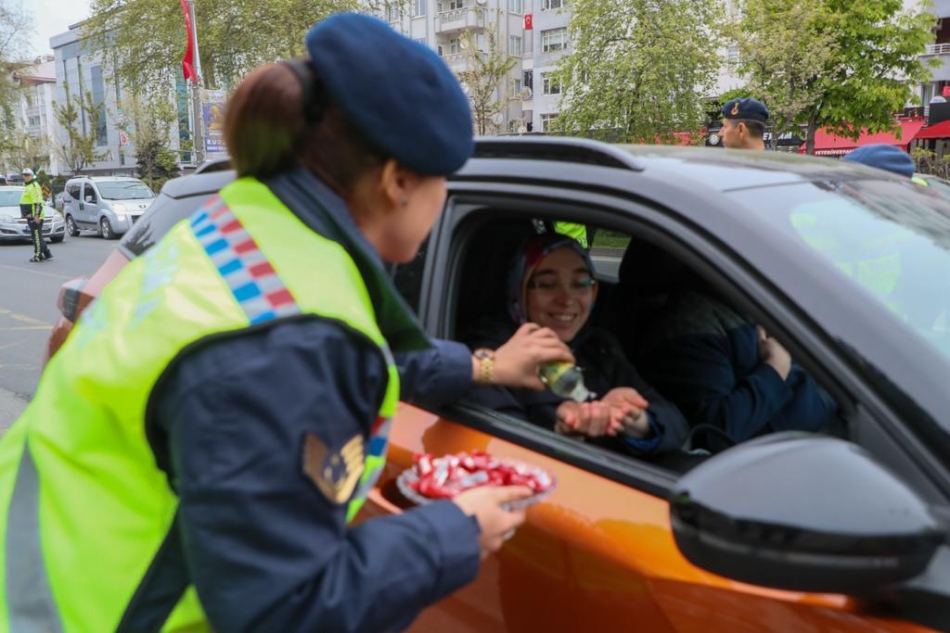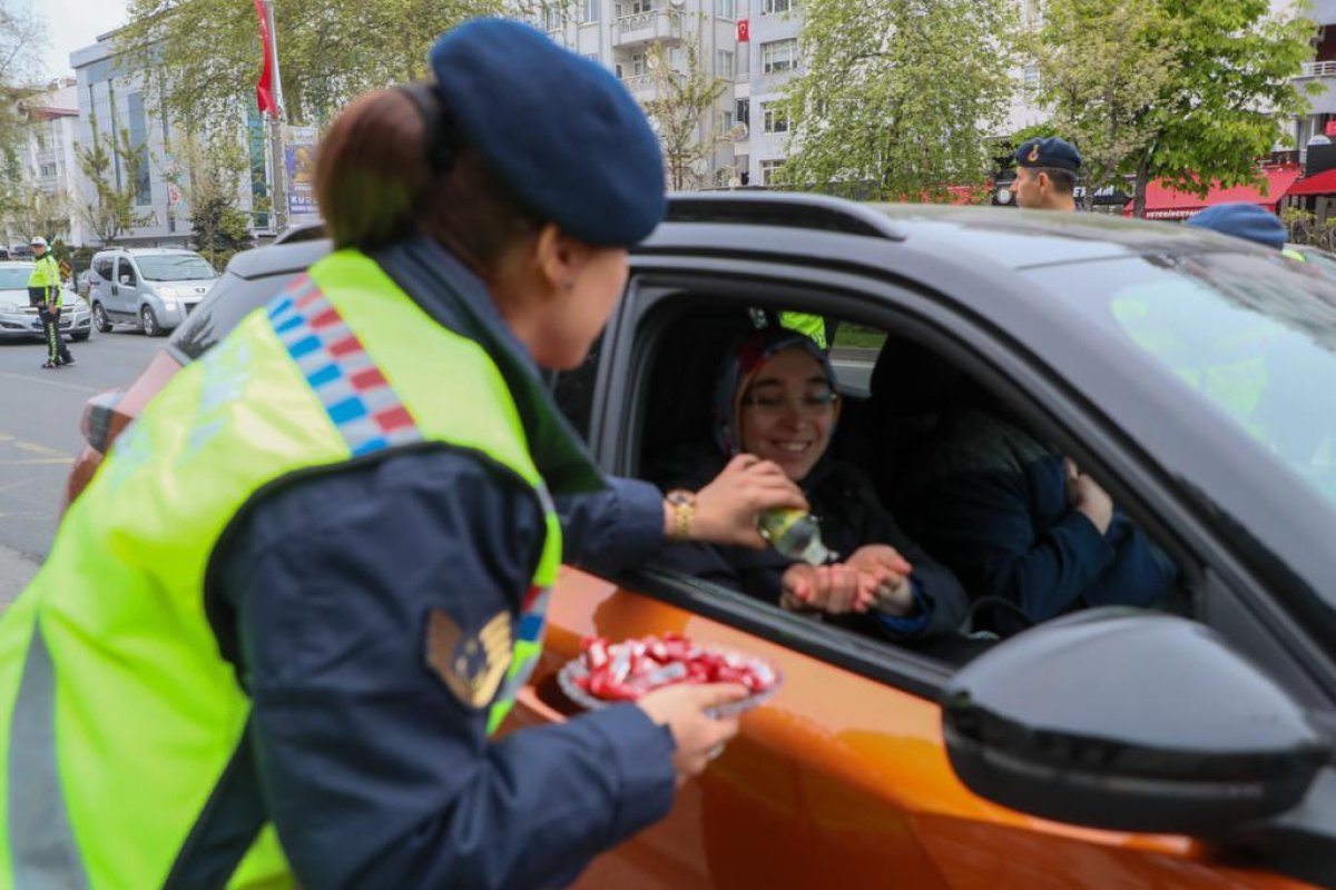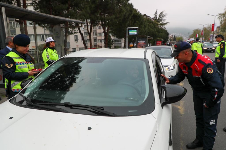 Bayram süresince devam edecek trafik kontrollerinde sürücülere bilgilendirici broşürler dağıtılıyor.