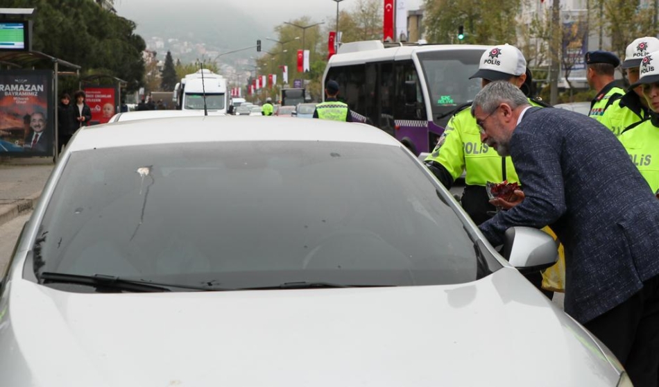 Sürücü ve yolculara çikolata da ikram eden Vali Sonel, araçlarda bulunan çocuklara da oyuncak hediye etti.