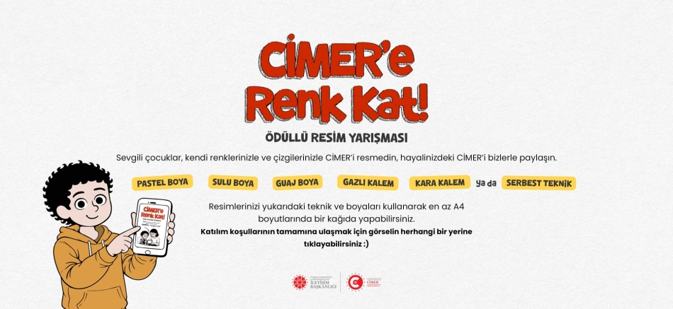 Cumhurbaşkanlığı İletişim Başkanlığı tarafından düzenlenen ödüllü 'CİMER'e Renk Kat' resim yarışmasıyla ilkokul ve ortaokul öğrencileri, hayallerindeki CİMER'i resimlerle anlatacak. CİMER'e kendi bakış açılarıyla katkı sunmaya davet için son başvuru tarihi 3 Nisan 2026.