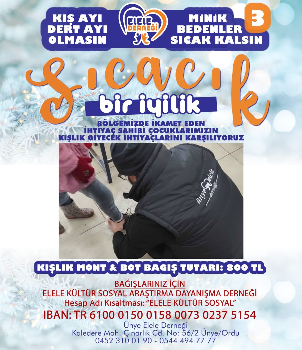Kurulduğu günden bu güne gerek içinde yer aldığı sosyal sorumluluk ve eğitim faaliyetleri, gerekse de muhtaç aile ve öğrencilere gıda ve giyecek yardımcı olsun, birçok alanda topladığı yardımları ilgililere ulaştıran Ünye Elele Derneği, “Kış Ayı Dert Ayı Olmasın, Minik Bedenler Sıcak Kalsın” adı altında yine bir yardım kampanyası başlattı.