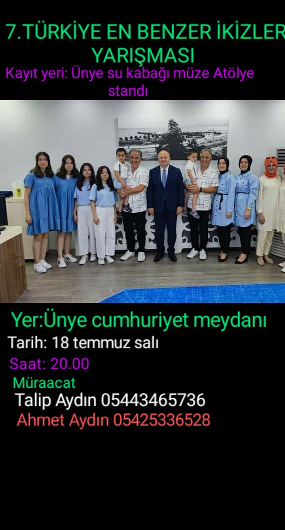 Ünye Belediyesi’nin katkıları ile ikiz kardeşler Talip Aydın ve Ahmet Aydın tarafından organize edilen 7. Türkiye En Benzer İkizler Yarışması 18 Temmuz saat 20:00’da Ünye Cumhuriyet Meydanı’nda yapılacak.