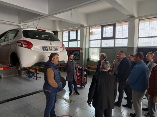 Okul bünyesinde bulunan üretim atölyelerini gezerek bilgi alan Ünye TSO Başkanı İrfan Akar ve ekibi Müdür Cuma Gündüz’e kapsamlı bilgilendirmesi için teşekkür etti.
