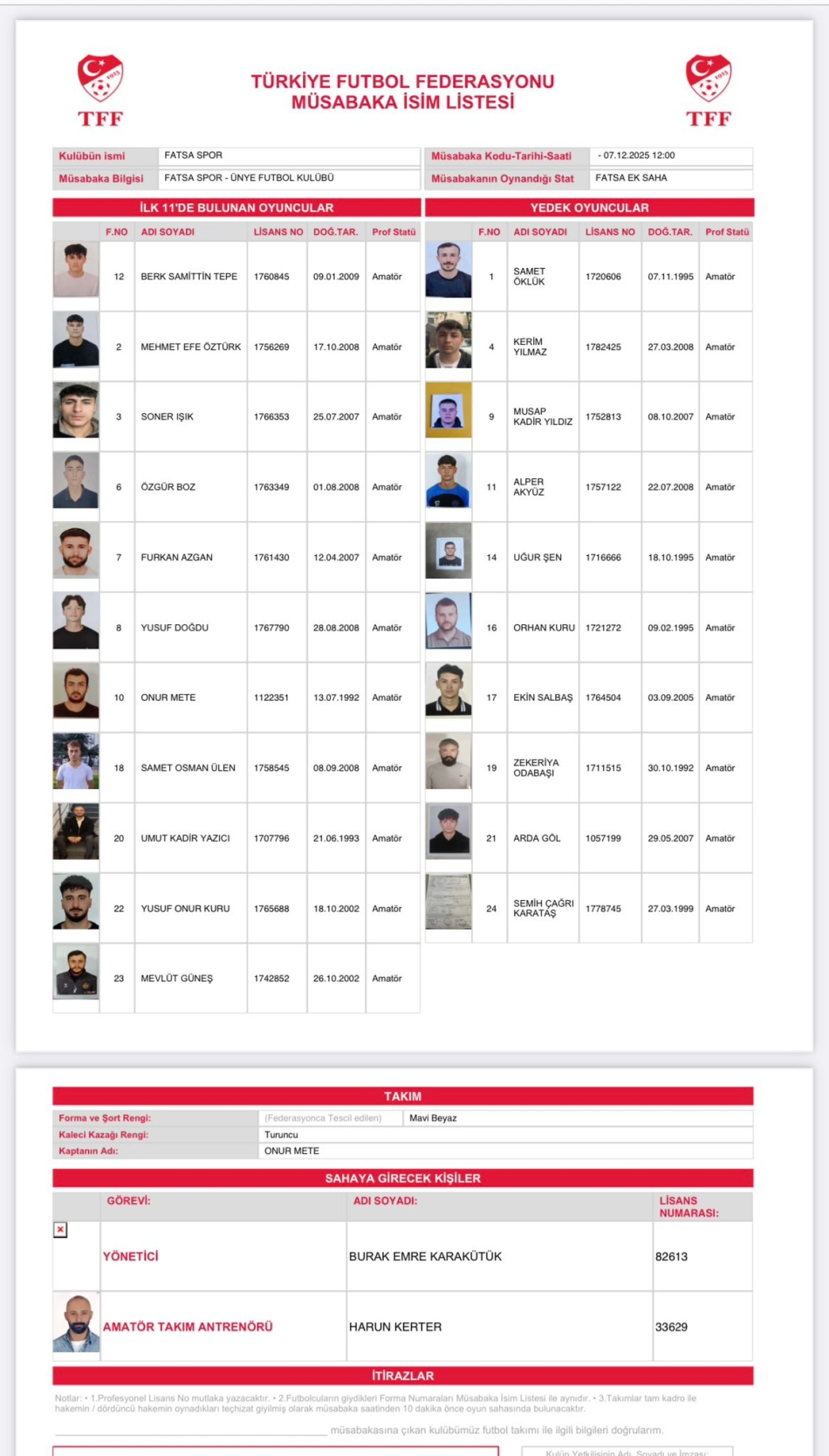 Fatsa ek sahada Zeki Yanık’ın yönettiği müsabakada yardımcı hakem olarak Şeref Han Baş ile Yahya Yıldız görev yaptı.