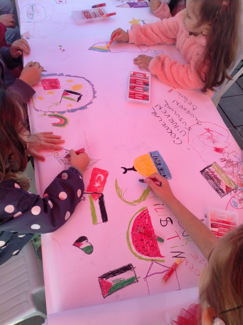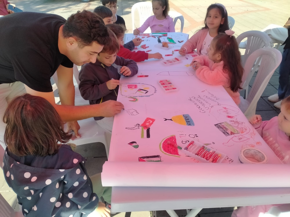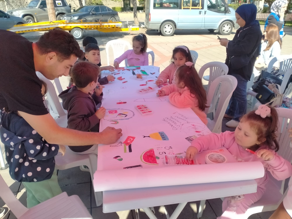 Gönüllülerin çocukları yönlendirdiği stantta çocukla; "K.til Netanyahu", "Özgü Filistin" gibi yazılar yazarak resim çizdiler.