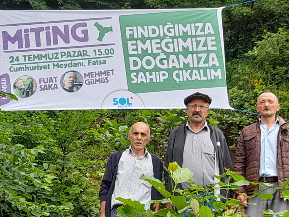 Başta Fatsa olmak üzere, Ordu’nun tüm ilçelerinde afiş ve pankart asarak vatandaşları mitinge davet eden Sol Parti, “Fındıkta sömürüye son” diyor.