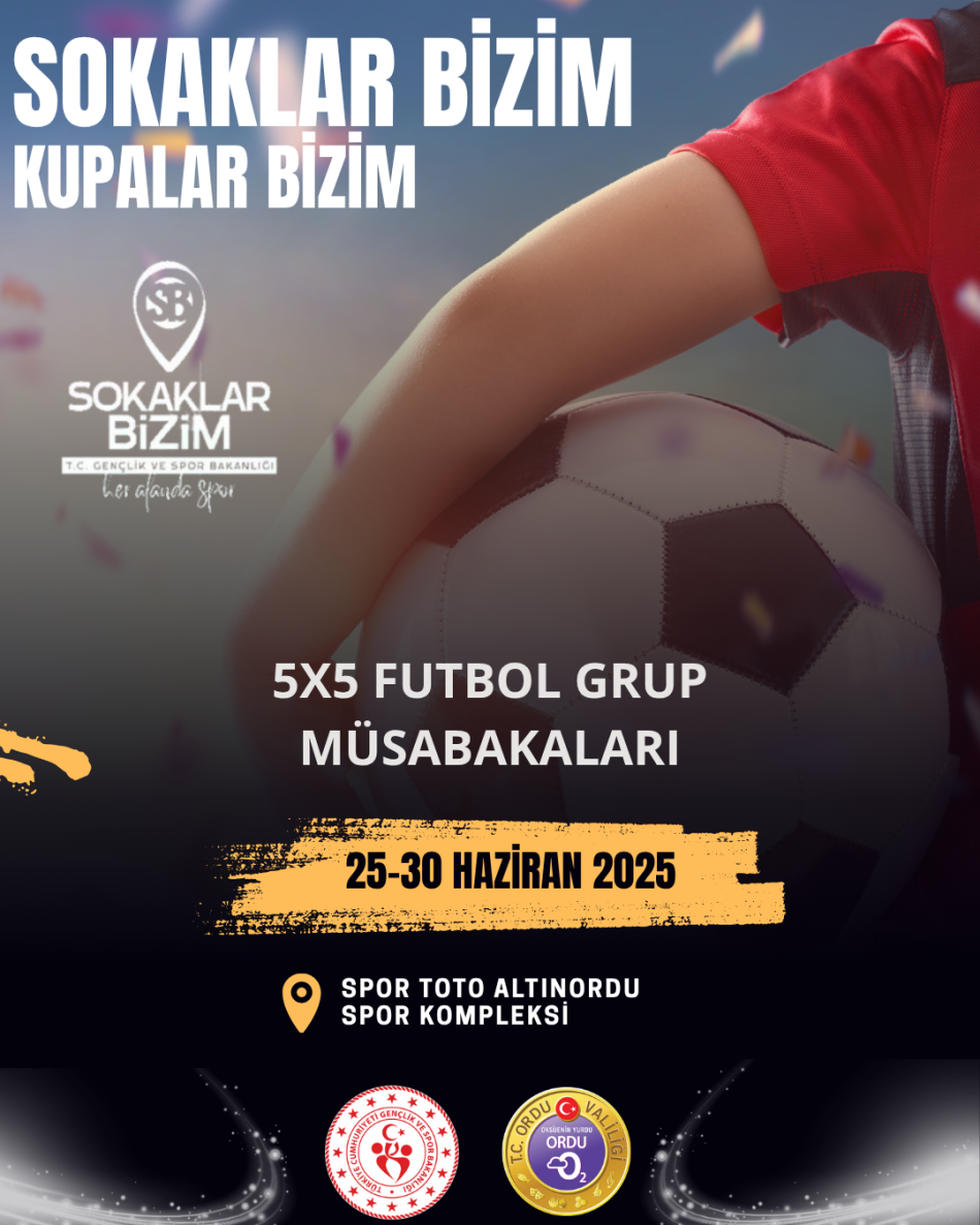 Gençlik ve Spor Bakanlığı’nın destekleriyle bu yıl ikincisi düzenlenen Sokaklar Bizim Kupalar Bizim 5x5 Futbol Grup Müsabakaları, Ordu’nun ev sahipliğinde 25-30 Haziran 2025 tarihleri arasında gerçekleştirilecek.
