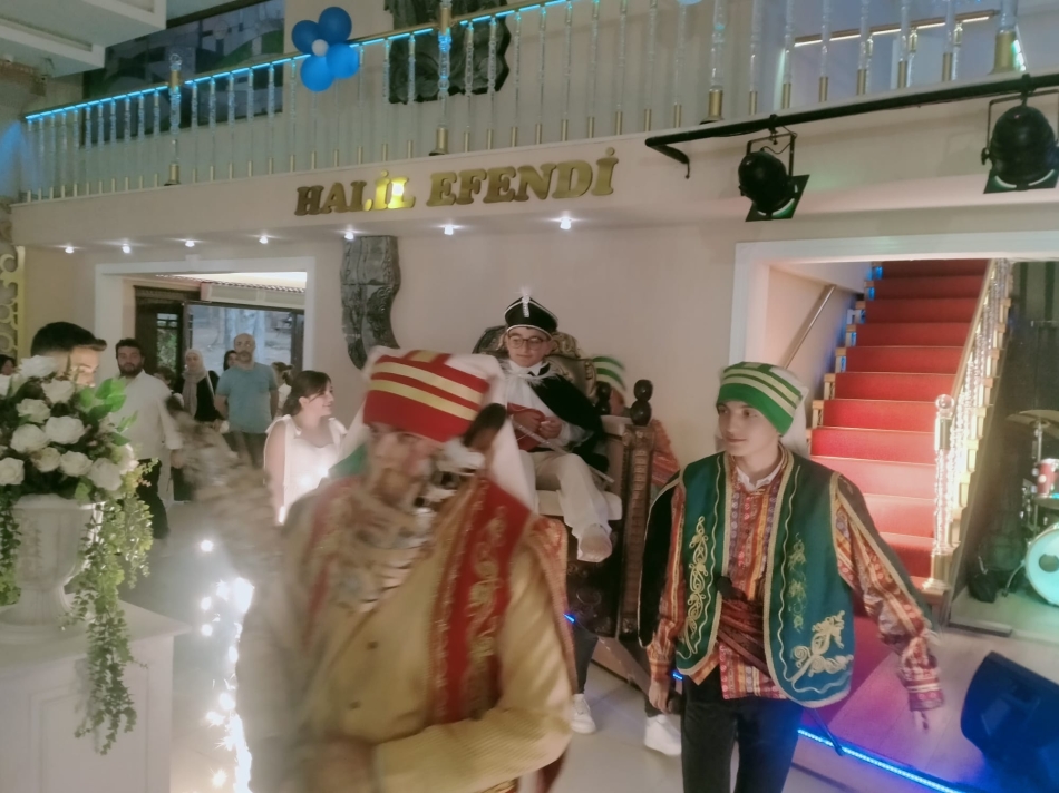 Piyanist şantör Cihan Kibiroğlu’nun birbirinden güzel şarkıları seslendirdiği sünnet düğününde küçük Hüseyin Kerem salona mehter marşı ile taht üzerinde giriş yaptı.