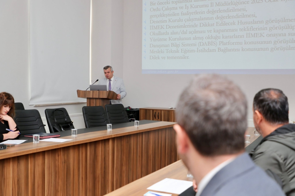İstihdam ve Mesleki Eğitim Kurulu toplantısında bir önceki toplantıda alınan kararlar ve yapılan çalışmaların değerlendirildiği toplantıda, Çalışma ve İş Kurumu İl Müdürü İsa Kaymak istihdam, kayıtlı iş arayan ve istihdam edenler, iş ve meslek danışmanlığı hizmetleri, mesleki eğitim kursları, işbaşı eğitim kursları, toplum yararına program, işgücü uyum, İŞKUR gençlik programı başta olmak üzere çeşitli konularda sunum yaptı.