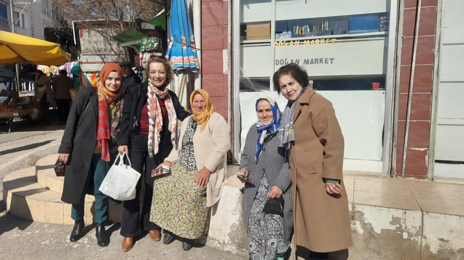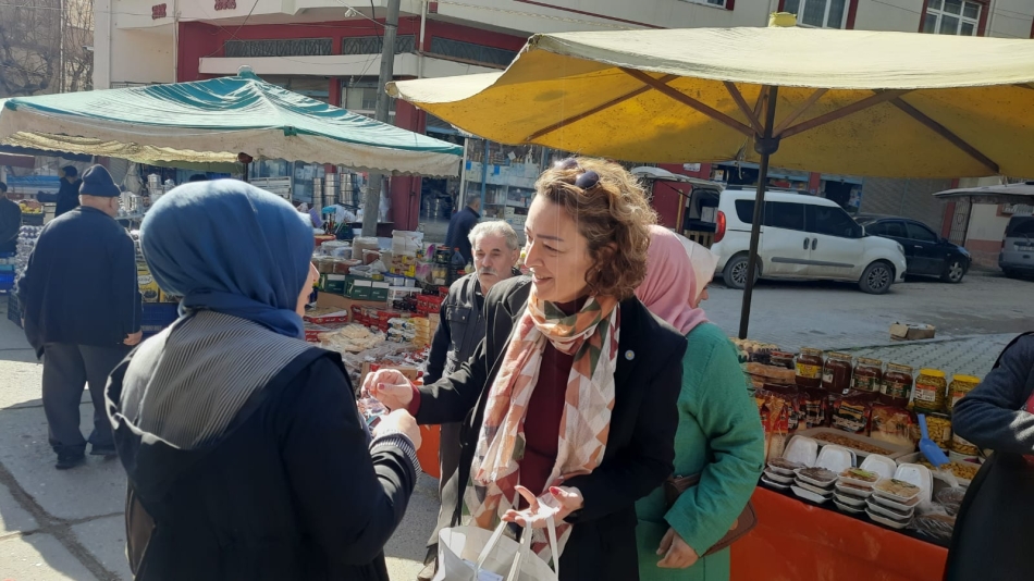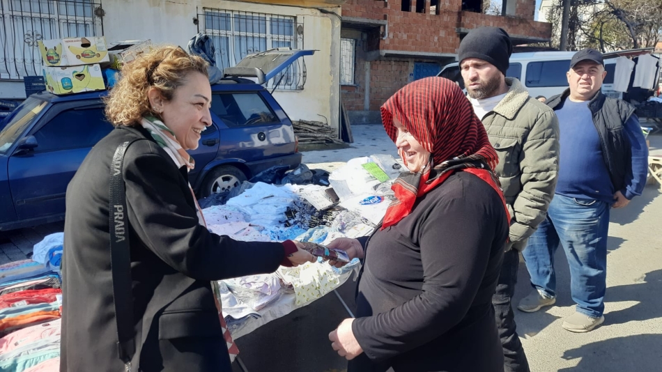 Ziyarette İlçe Başkanı Servet Zeren ve ekip arkadaşları Betonyol pazarında Pazar esnaflığı yapan emekçi kadınların 8 Mart Dünya Emekçi Kadınlar günü kutladı.