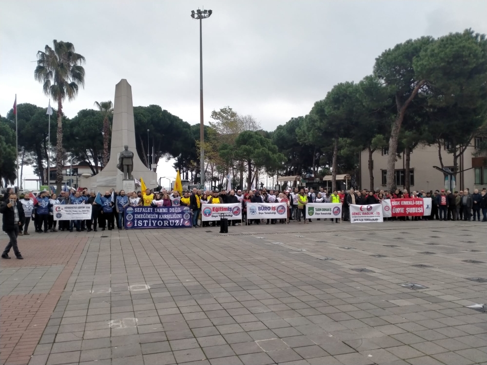Basın açıklaması esnasında, “Yaşasın örgütlü mücadelemiz”, “Direne direne kazanacağız”, “Türkiye sevdamız emek için kavgamız”, “İnsanca yaşamak istiyoruz”, “Onurlu yaşam hakça paylaşım”, Saraylar yıkılır direnenler kazanır”, “TÜİK şaşırma sabrımızı taşırma”, “Sefalete teslim olmayacağız” gibi sloganlar atıldı. Bazı vatandaşların da destek verdiği basın açıklaması çektirilen hatıra fotoğrafları ile sona erdi.