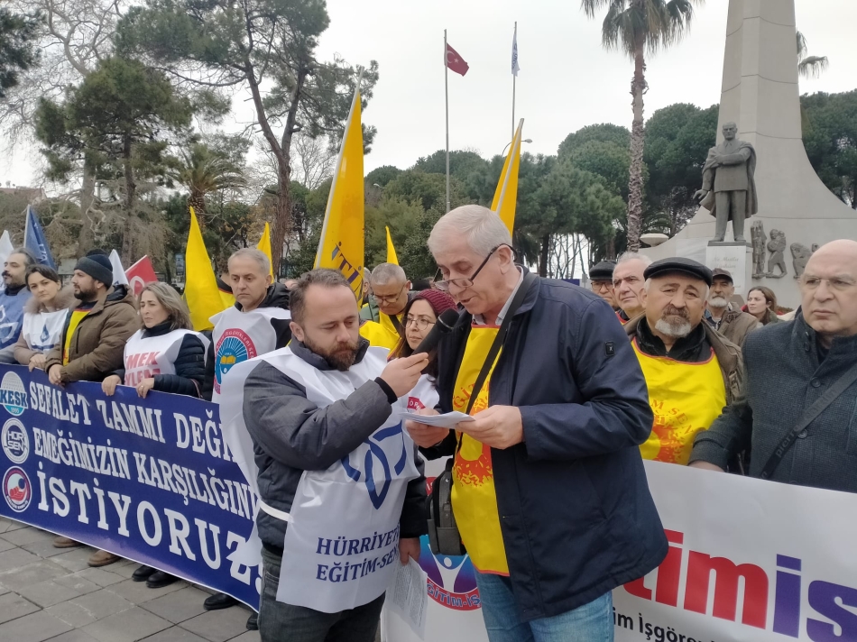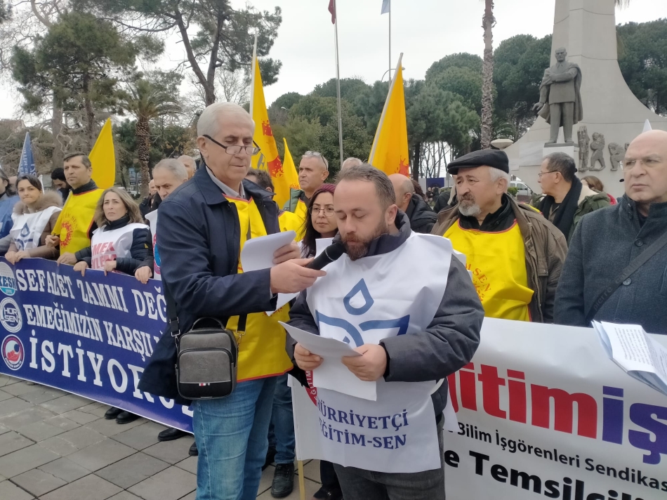 Cumhuriyet Meydanı’nda Eğitim-Sen, Hürriyetçi Eğitim-Sen ve Eğitim-İş sendikalarının temsilcileri ortak basın metnini okudu.