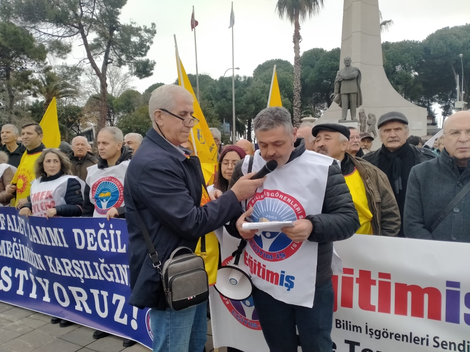 Siyasi iktidarın toplumun büyük bölümünü oluşturan işçiler, kamu emekçileri ve emeklileri sefalete mahkûm eden politikalarına ve emeğimizin değersizleştirilmesine karşı bir kez daha sesimizi yükseltmek ve taleplerimizi kamuoyuyla paylaşmak için buradayız. Temel tüketim maddelerine ve kiralara yapılan yüksek oranlı zamlar, kamu emekçilerinin geçim koşullarını zorlaştırırken, alım gücümüzün her geçen gün biraz daha düşmesine neden oluyor. Bu nedenle, vergide adaletin sağlanması, ek ödemelerin emekliliğe yansıtılması, insanca yaşayacak bir ücret talebi bugün tüm kamu emekçilerinin ortak talebi haline gelmiş durumdadır.