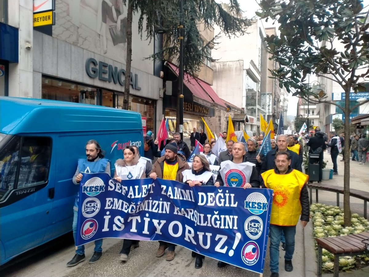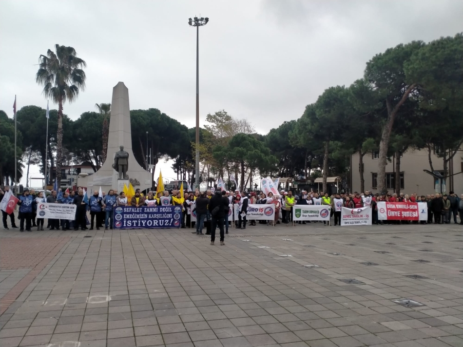 Ülke genelinde 1 günlük iş bırakma eylemi gerçekleştiren KESK, HÜR-SEN ve BİRLEŞİK KAMU-İŞ konfederasyonlarına bağlı sendikalar Ünye Cumhuriyet Meydanı’nda yaptıkları ortak basın açıklamasında; “Sefalet zammı değil, emeğimizin karşılığını istiyoruz” diye haykırdı.