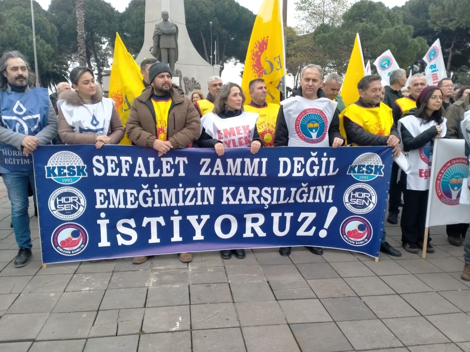 İş yerlerinde alın teri döken bizler, enflasyon karşısında ezilirken sermaye her geçen gün daha fazla kâr ediyor. Vergi yükünün büyük bölümü emekçilerin omuzlarına yıkılırken, zenginlerin vergi borçları birer birer siliniyor. Kamu kaynakları, halkın ihtiyaçları yerine sermayeye ve yandaş projelere aktarılıyor. Bu adaletsiz düzenin bedelini yıllardır neden sadece biz emekçiler ödüyoruz? Kamu emekçilerinin, işçilerin, emeklilerin “insanca yaşayacak ücret” taleplerini görmezden gelen siyasi iktidarın ücretlerimizi baskılayıp, boğazımızı sıkarak uygulamaya çalıştığı ekonomik programa karşı kamu emekçileri olarak itiraz ediyoruz.