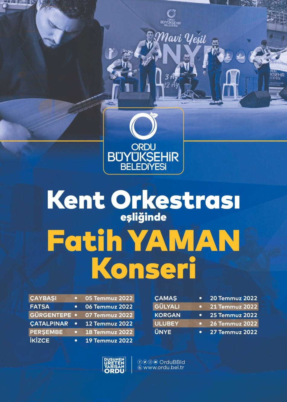Ordu Büyükşehir Belediyesi Kent Orkestrası, Sanatçı Fatih Yaman ile birlikte ilçeleri gezerek Türk müziğinin sevilen eserlerinden oluşan konserde vatandaşlarla buluşacak.