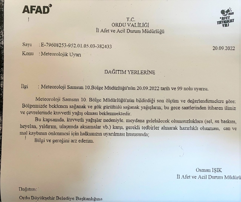 “Meteoroloji Samsun 10. Bölge Müdürlüğü’nün bildirdiği son ölçüm ve değerlendirmelere göre; Bölgemizde beklenen sağanak ve gök gürültülü sağanak yağışların; bı gece saatlerinden itibaren ilimiz ve çevrelerinde kuvvetli yağış olması beklenmektedir. Bu kapsamda kuvvetli yağışlar nedeniyle,meydana gelebilecek olumsuzluklara (sel, su baskını, heyelan, yıldırım, ulaşımda aksamalar vb.) karşı gerekli tedbirler alınarak hazırlıklı olunması, can ve mal kaybının önlenmesi için halkımızın uyarılması hususunda; Bilgi ve gereğini arz ederim.”