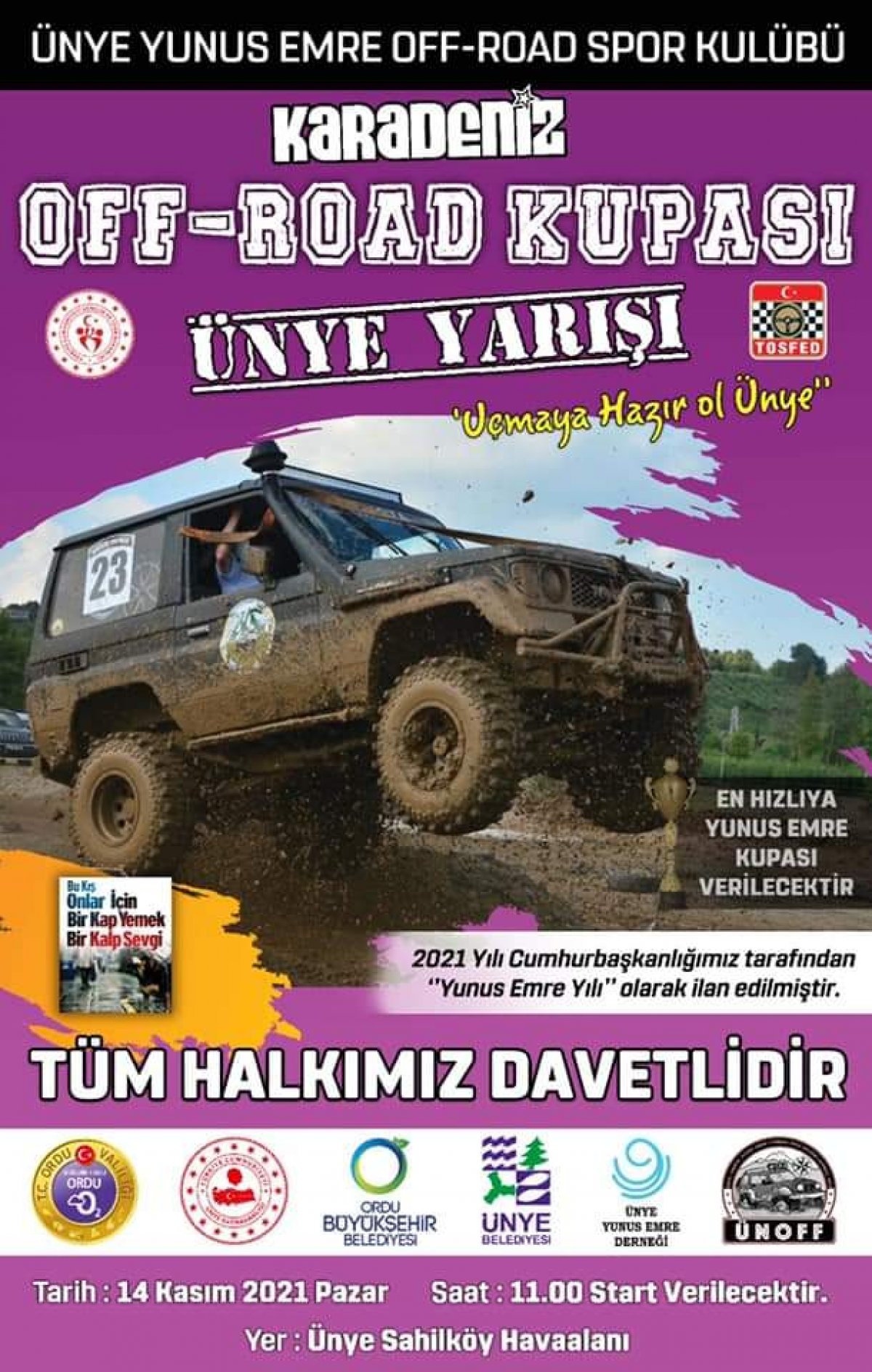 12-13-14 Kasım tarihlerinde bölgede düzenlenecek olan Yunus Emre Anma etkinlikleri kapsamında Ünye Yunus Emre Off-road Spor Kulübü yapılacak olan Off-raod yarışıyla bu kapsamdaki etkinliklere destekte bulunacak.
