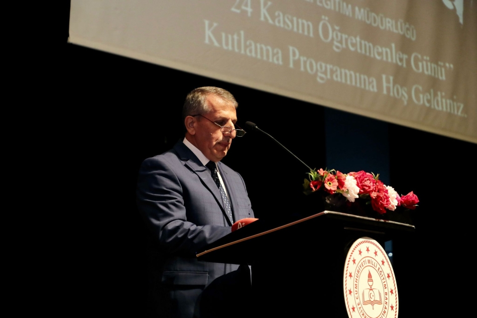 Saygı duruşu ve İstiklal Marşı’nın okunması ile başlayan kutlama programında bir konuşma yapan İl Milli Eğitim Müdürü Mehmet Fatih Vargeloğlu, “Değerli Meslektaşlarım, sizler, öğrencilerimizin zihninde beliren ilk soruyu değerli bir arayışa dönüştüren; bilginin soğukluğunu merhametle ısıtıp çocuğun dünyasında anlamlandıran büyük sanatkârlarsınız. Dersliklerinizde kurduğunuz her cümle, yalnızca bir konuyu öğretmek için değil; aklı arkadaş, bilgiyi kardeş kılmak içindir. Bu nedenle öğretmenlik, sadece bir meslek değil; insan yetiştirme sanatı, geleceği şekillendiren bir ahlâk, bir milletin kaderini belirleyen stratejik bir görevdir. Tam da bu sebeple, bugün ülkemizin eğitimde attığı her yeni adımın merkezinde yine öğretmen yer almaktadı.r” dedi.