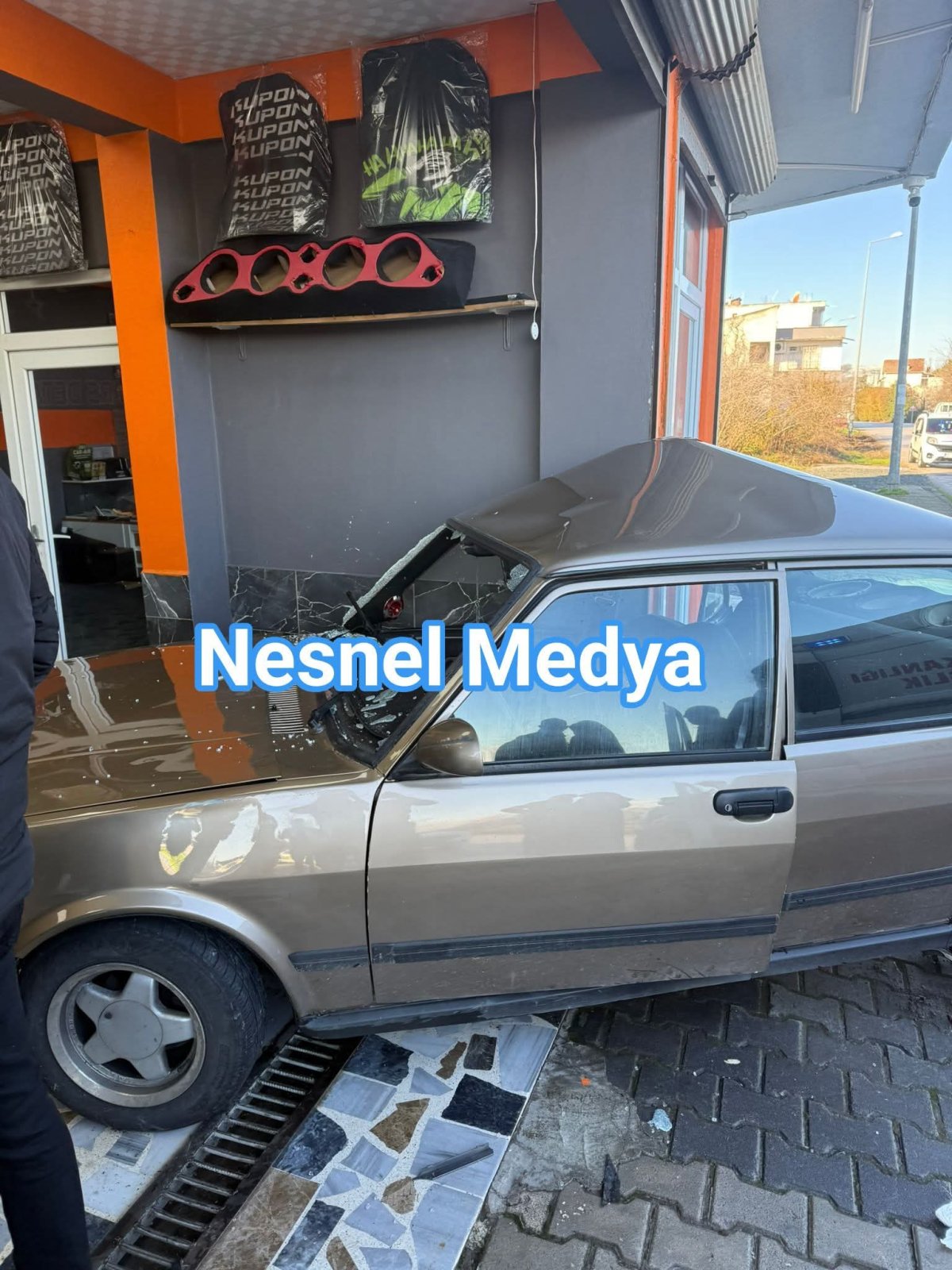 Bir otomobil sürücüsünün direksiyon hakimiyetini kaybetmesi sonucu önce yol kenarlarındaki yayaya çarptı, sonra da işyerine savrularak işletmede bulunan araca çarptı.