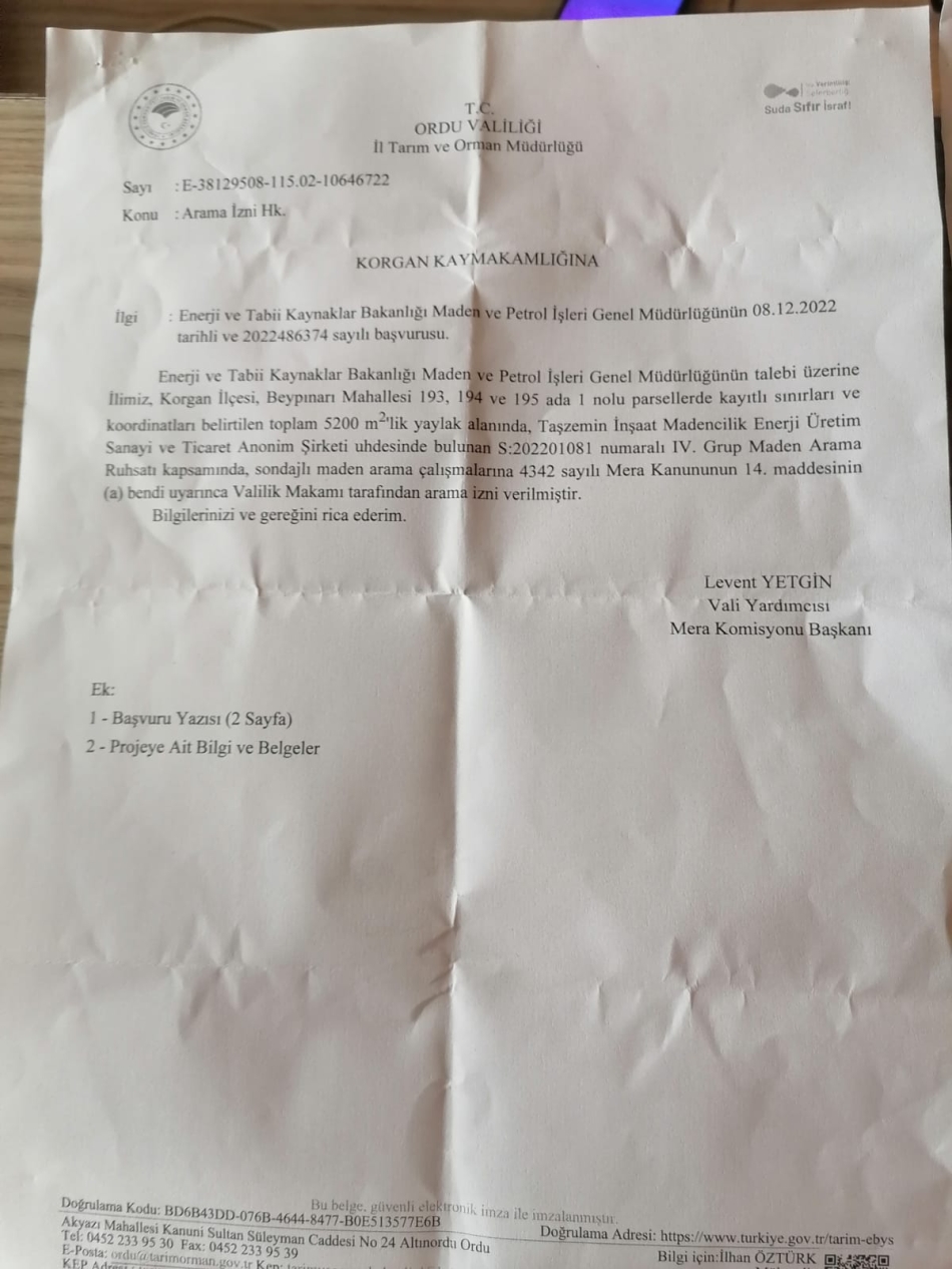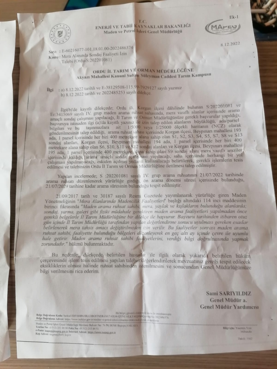 ORÇEV’in, Ordu’nun yüzde 74’ünün maden sahası olarak belirlendiğine dikkat çekilen açıklamada, “İlimizin yüzde 74’ü maden sahası kapsamına alındı. Kiminde ÇED süresi başlatıldı. Halkla yaptığımız toplantılar sonrası İdare Mahkemesine davalar açmaya başladık. Ancak Korgan yaylasında yapılan sondajın ne ÇED kararı var ne de Tarım Orman İl Müdürlüğü Mera Kurulu’nun kararı. Kimse kafasına göre sondaj yapamaz ve hiçbir makam da kendince izin veremez. Ordu Valiliği’nin şirketin sondaj yapabilmesi için izin yazısı var. Ancak bu izin geçerli değil.” denildi.