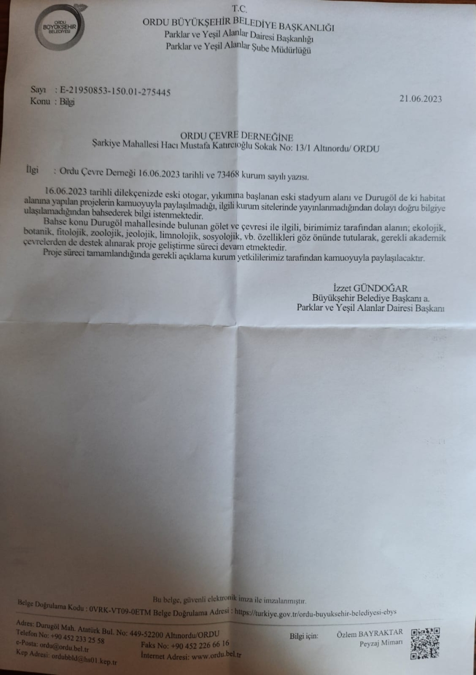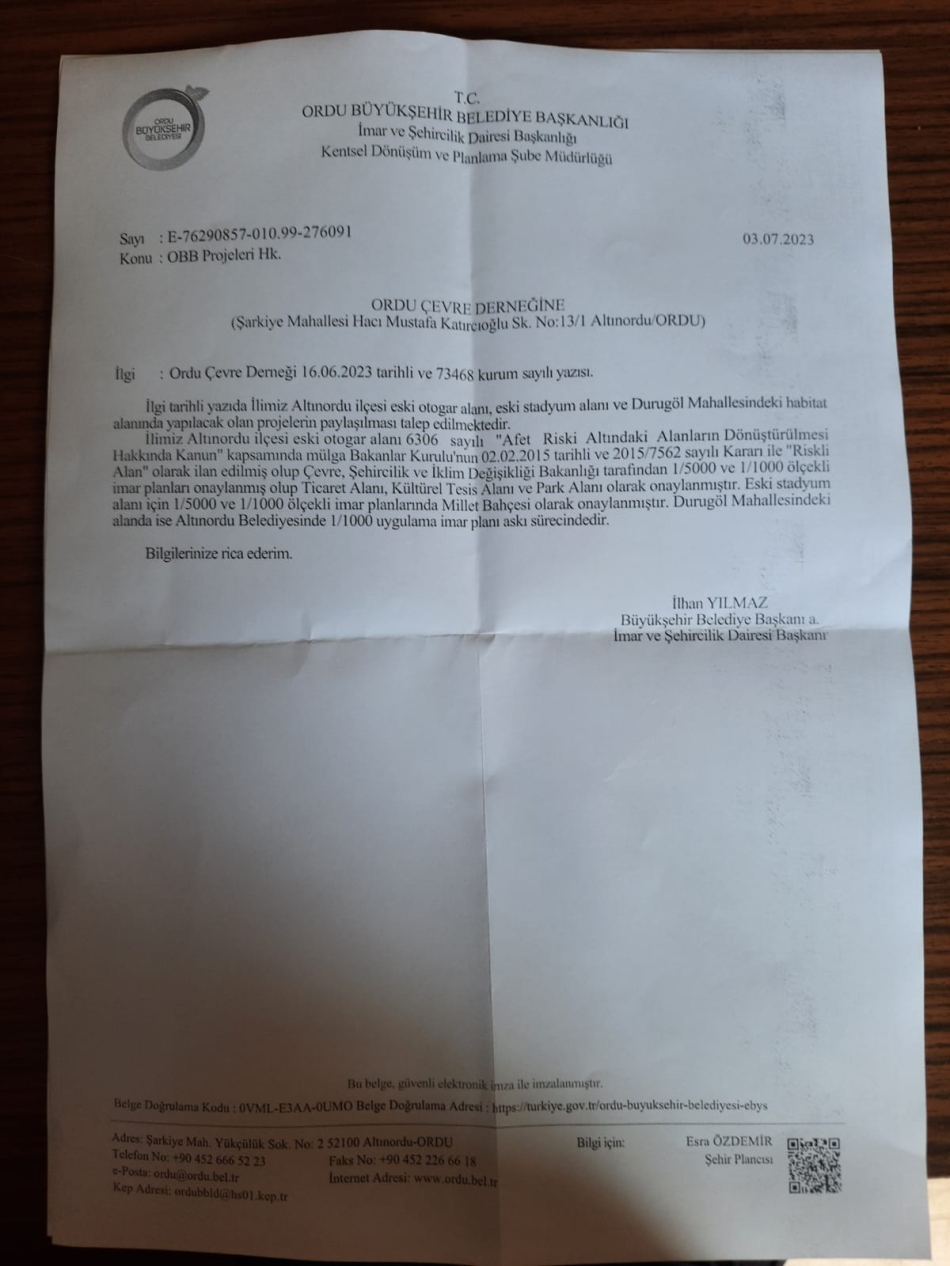 İmar ve Şehircilik Daire Başkanlığından ise sorularımıza, “…ilgili yanınızda…bilgi istenmektedir. İlimiz Altınordu ilçesi eski otogar alanı 6306 sayılı “Afet Riski Altındaki Alanlarının Dönüştürülmesi Hakkında Kanun” kapsamında mülga Bakanlar Kurulu’nun 02.02.2015 tarihli ve 2015/7562 sayılı Kararı ile “Riskli Alan” olarak ilan edilmiş olup Çevre Şehircilik ve İklim Değişikliği Bakanlığı tarafından 1/500 ve 1/ 1000 ölçekli imar planları onaylanmış olup Ticaret Alanı, Kültürel Tesis ve Park Alanı olarak onaylanmıştır. Eski stadyum alanı için 1/5000 ve 1/1000 ölçekli imar planlarında Millet Bahçesi olarak onaylanmıştır. Durugöl Mahallesindeki alan ise Altınordu Belediyesinde 1/1000 uygulama imar planı askı sürecindedir.” Bu yazı da çelişkilerle dolu. Proje soruyoruz, kararlardan söz ediliyor. İki yazıda Durugöl hakkında çelişkili yanıt var. Birinde proje yapılıyor deniyor, ikincisinde de imar planı askıda deniyor. Oysa imar planı askıdan indi ve imar planının iptali için açılan dava devam ediyor. Böyle çelişkilerle dolu yanıtlar aslında belediyenin projesiz ve ben yaptım oldu mantığıyla hareket ettiğini göstermektedir.” denildi.