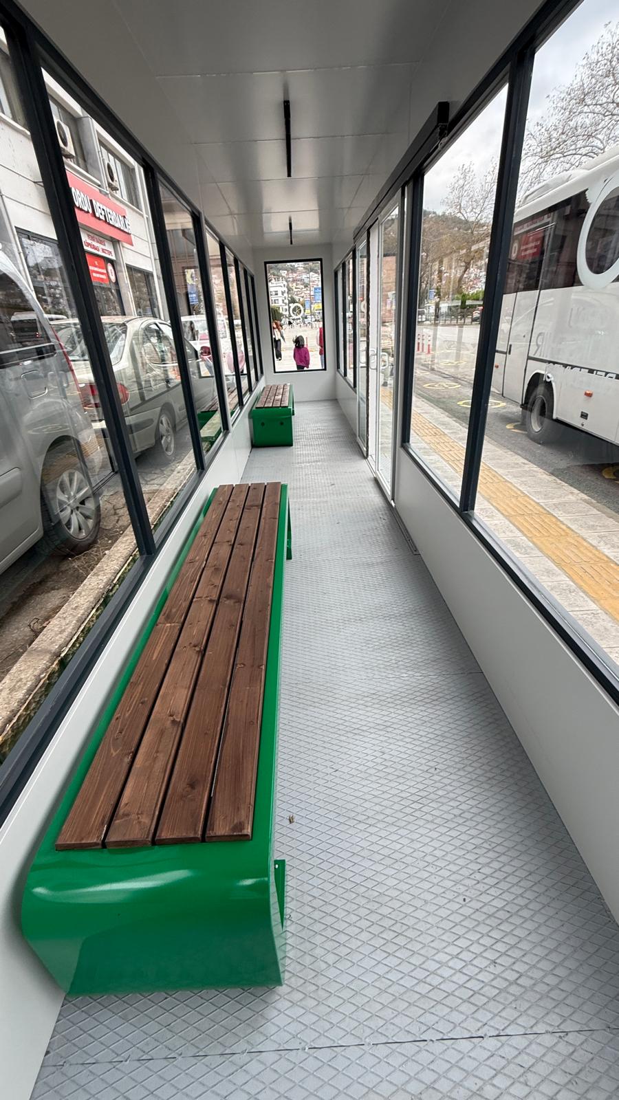 Aydınlatmalı ve engelli erişimine uygun olarak tasarlanan duraklarda, vatandaşların konforlu şekilde bekleyebilmesi için 2 adet oturma bankı bulunuyor.