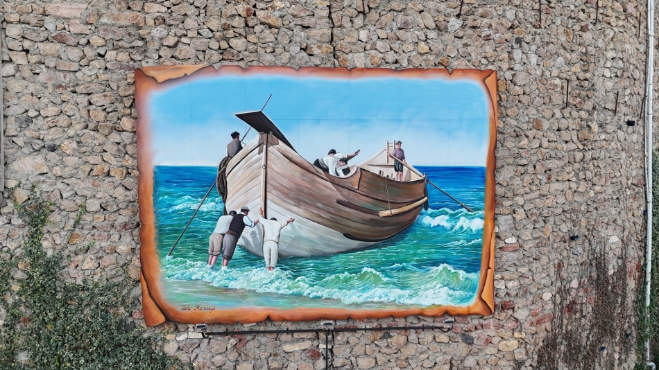 Kirazlimanı Yaşam alanında geçmişte yörede yük taşımacılığında uzun yıllar kullanılan geleneksel deniz aracı mavna, eski bir fotoğraftan referans alınarak duvara resmedildi.