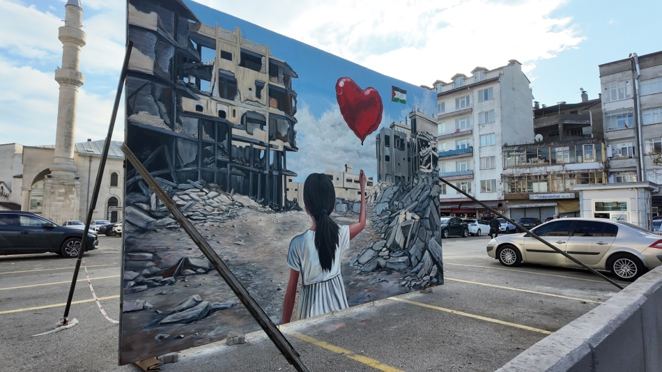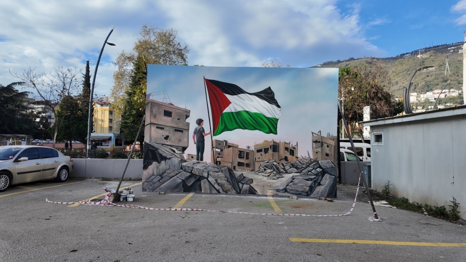 Orta Cami girişindeki duvarlarda ise Filistin’de yaşanan insanlık dramına dikkat çekmek amacıyla iki tematik resim çalışması yapıldı.