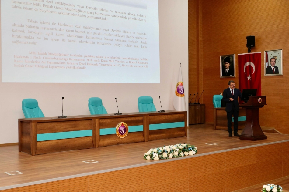 Halit Demirkol, yapmış olduğu sunumunda; mülkiyeti Hazineye ait taşınmazların tahsis ve devir, kamu konutlarının kiralanması, Hazineye ait taşınmazların kiralama ve satışı, kamulaştırma işlemleri, irtifak hakkı, terk ve tapudan terkin işlemleri, ifraz, tevhit ve rızai taksim işlemleri ile 2/B arazilerinin satış işlemlerinde Valiliklere ve Kaymakamlıklara devredilen yetkiler hakkında detaylı bilgiler verdi.