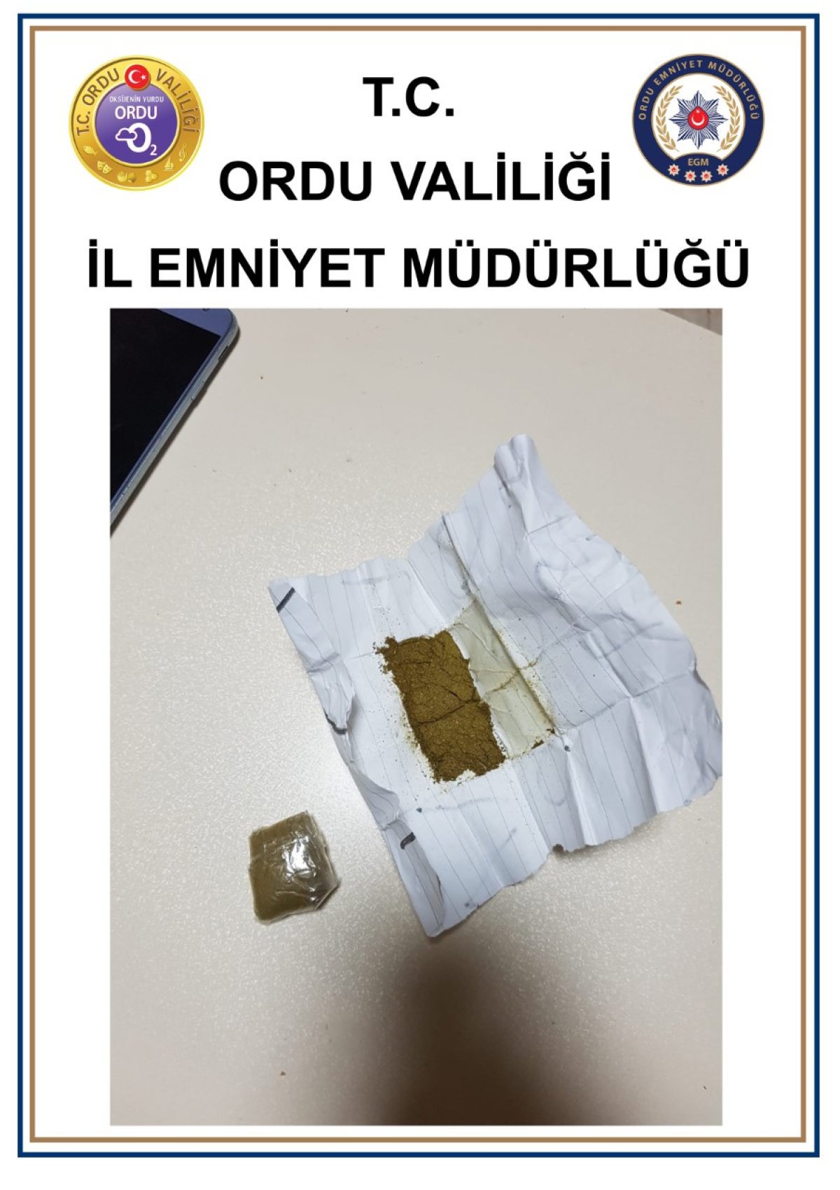Ordu İl Emniyet Müdürlüğü tarafından 16.01.2023 ile 22.01.2023 tarihleri arasında Narkotik Suçlarla mücadele kapsamında yapılan çalışmalar neticesinde, farklı gramlarda esrar ve metamfetamin maddesi ele geçirildi.