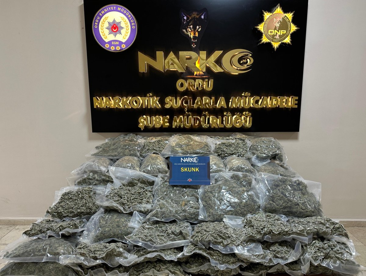 Ordu İl Emniyet Müdürlüğüne bağlı ekiplerce, uyuşturucu ile mücadele kapsamında yapılan çalışmalar sonucunda; 18.10.2024 günü batı illerine sevkiyat halinde olan tır ve içerisinde bulunan yabancı uyruklu 2 şüpheli şahıs yakalanmış, yapılan aramalarda; 68 kilo 500 gram Skunk maddesi ele geçirildi.