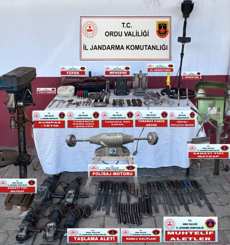 Ordu Cumhuriyet Başsavcılığı koordinesinde Ordu İl Jandarma Komutanlığına bağlı 08 Temmuz 2025 tarihinde E.B. (53/E), H.K. (75/E) ve D.A.K. (70/E) isimli şahıslara ait (3) farklı adreste adli arama gerçekleştirilmiş olup (2) adet tabanca gövdesi, (3) adet tabanca üst kapağı, (4) adet tabanca namlusu, (4) adet tabanca mekanizması, (1) adet tabanca horozu, (8) adet tabanca kabzesi, (16) adet tabanca iğnesi, (9) adet icra yayı ve mili, (4) adet tabanca kalıbı, (8) adet tabanca şarjörü, (69) adet tabanca fişeği, (1) adet av tüfeği, (2) adet elektrik fünyeli patlayıcı madde ve tabanca yapımında kullanılan sanayi tipi makinalar ve çok sayıda muhtelif malzeme ele geçirilerek şüpheli şahıslar gözaltına alındı.