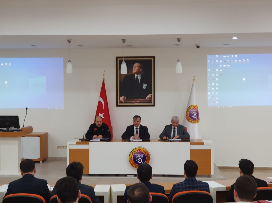 Eski Valilik binasında, AFAD’dan Sorumlu Vali Yardımcısı Bayram Gale başkanlığında yapılan Koordinasyon Toplantısına, Vali Yardımcısı Turgay Ergin, İlçe Kaymakamları, İlçe Belediye Başkanları, Ordu Büyükşehir Belediyesi Genel Sekreteri Sait İnan, bazı kamu kurumlarının müdürleri, Ordu, Fatsa ve Ünye Ticaret ve Sanayi Odası ile Ticaret Borsası Başkan ve yöneticileri, 19 ilçemizin Esnaf ve Sanatkarlar Odaları, Ziraat Odaları, Sosyal Yardımlaşma ve Dayanışma Vakfı Müdürleri ve bazı sivil toplum kuruluşlarının yöneticileri katıldı.