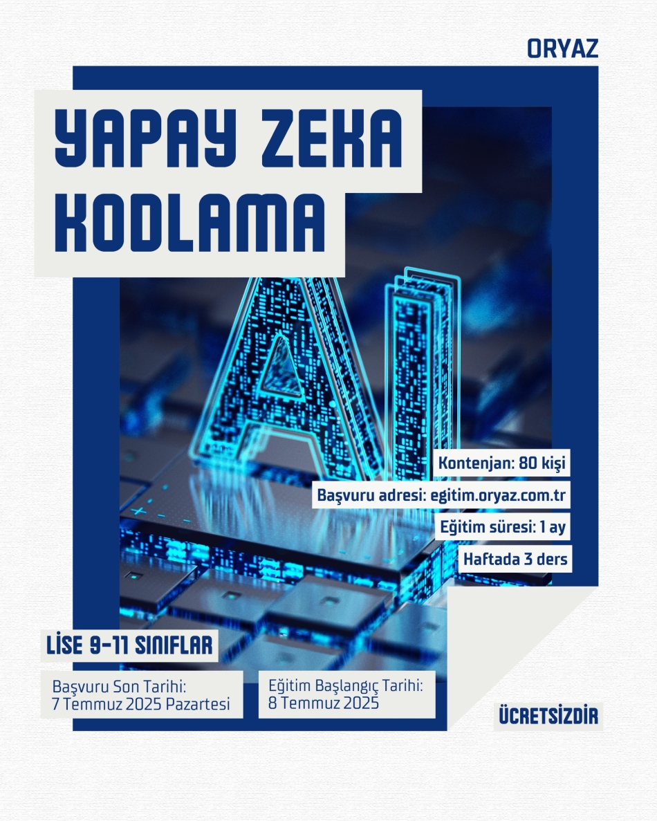 “Yapay Zeka Kodlama Eğitimi” kapsamında öğrenciler, veri işleme, algoritma geliştirme ve temel yapay zeka uygulamalarını Python tabanlı bir yaklaşımla öğrenecek. Katılımcılar, çağın en stratejik yetkinliklerinden biri olan yapay zekayı kullanarak kendi projelerini üretme fırsatı yakalayacak.