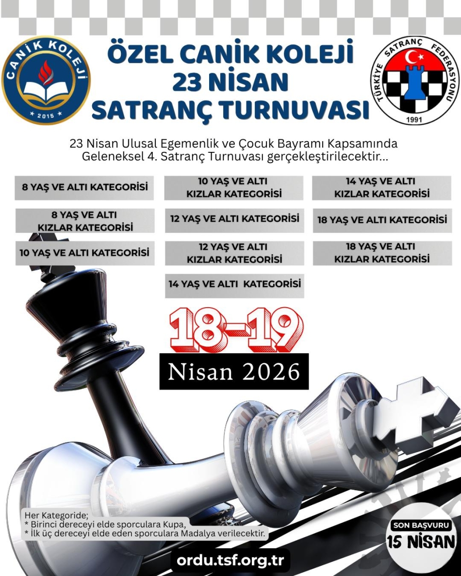 Özel Ünye Canik Koleji, Türkiye Satranç Federasyonu iş birliği ile gerçekleştirilecek 4. Geleneksel 23 Nisan Ulusal Egemenlik ve Çocuk Bayramı Satranç Turnuvasına ev sahipliği yapmaya hazırlanıyor.