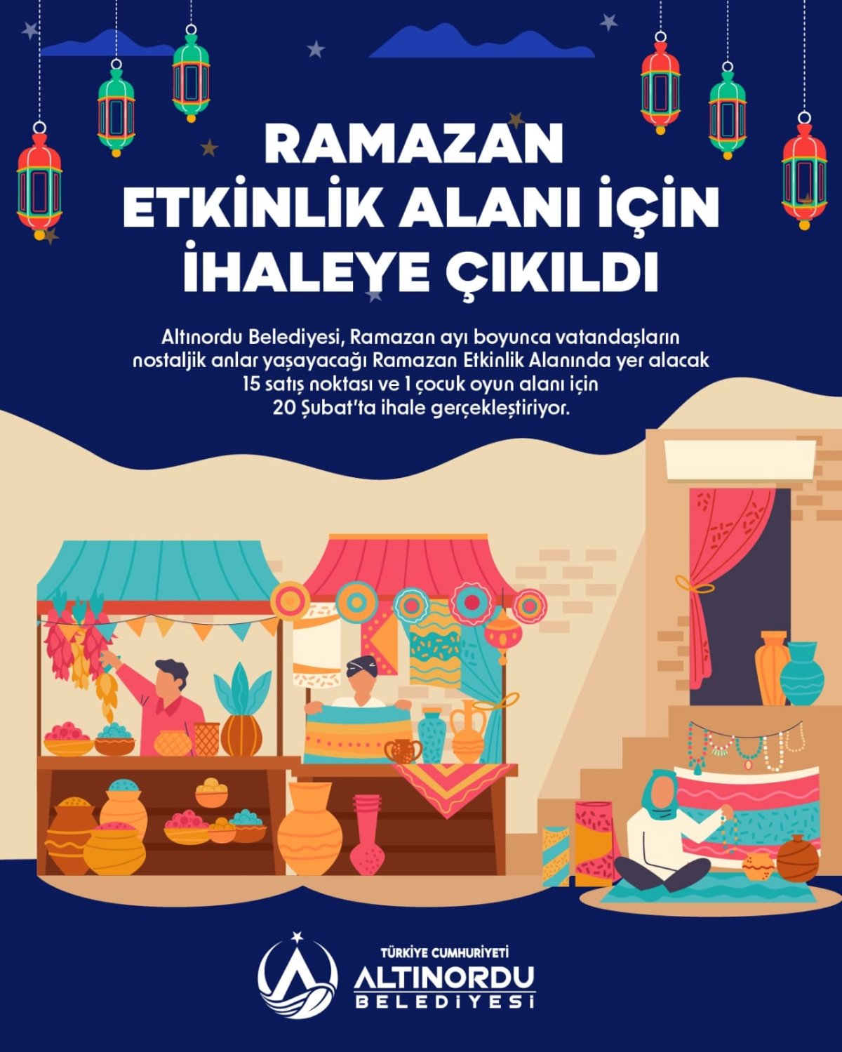 Altınordu Belediyesi, Ramazan ayı boyunca vatandaşların nostaljik anlar yaşayacağı Ramazan Etkinlik Alanında yer alacak 15 satış noktası ve 1 çocuk oyun alanı için 20 Şubat’ta ihale gerçekleştiriyor.