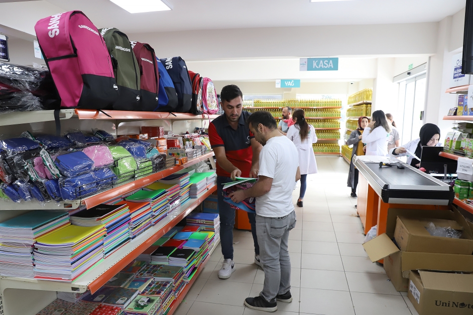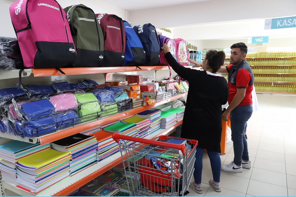 Sosyal Market aracılığıyla sağlanan destek kapsamında öğrencilere ilkokul çantası (beslenmeli), ortaokul lise çantası, abaküs, su matarası, kırmızı kalem, kurşun kalem, 12’li kuru boya, silgi, 60 sayfa küçük boy kareli defter, 60 sayfa küçük boy çizgili defter, 40 sayfa orta boy resim defteri, kalemlik, kalemtıraş, 60 sayfa büyük boy çizgili defter, yapıştırıcı ve 60 sayfa büyük boy kareli defter
