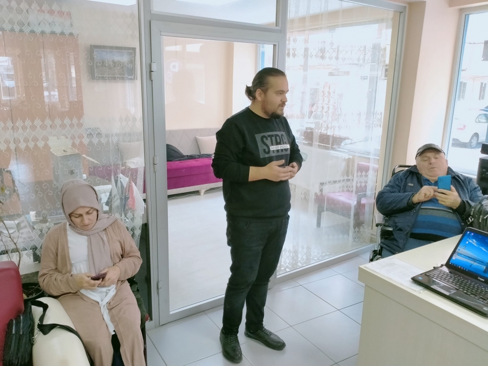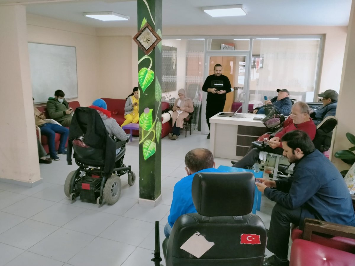 Türkiye Sakatlar Derneği Ünye Şubesi’nin lokalinde her hafta belirli gün ve saatlerde düzenlenen eğitim faaliyetini ESAK Başkan Yardımcısı ve Proje Koordinatörü Mehmet Çolakoğlu yakından takip ederken, TSD Ünye Şubesi üyelerine projeyle ilgili eğitimi Sosyal Medya Uzmanı Onur Korkmaz veriyor.