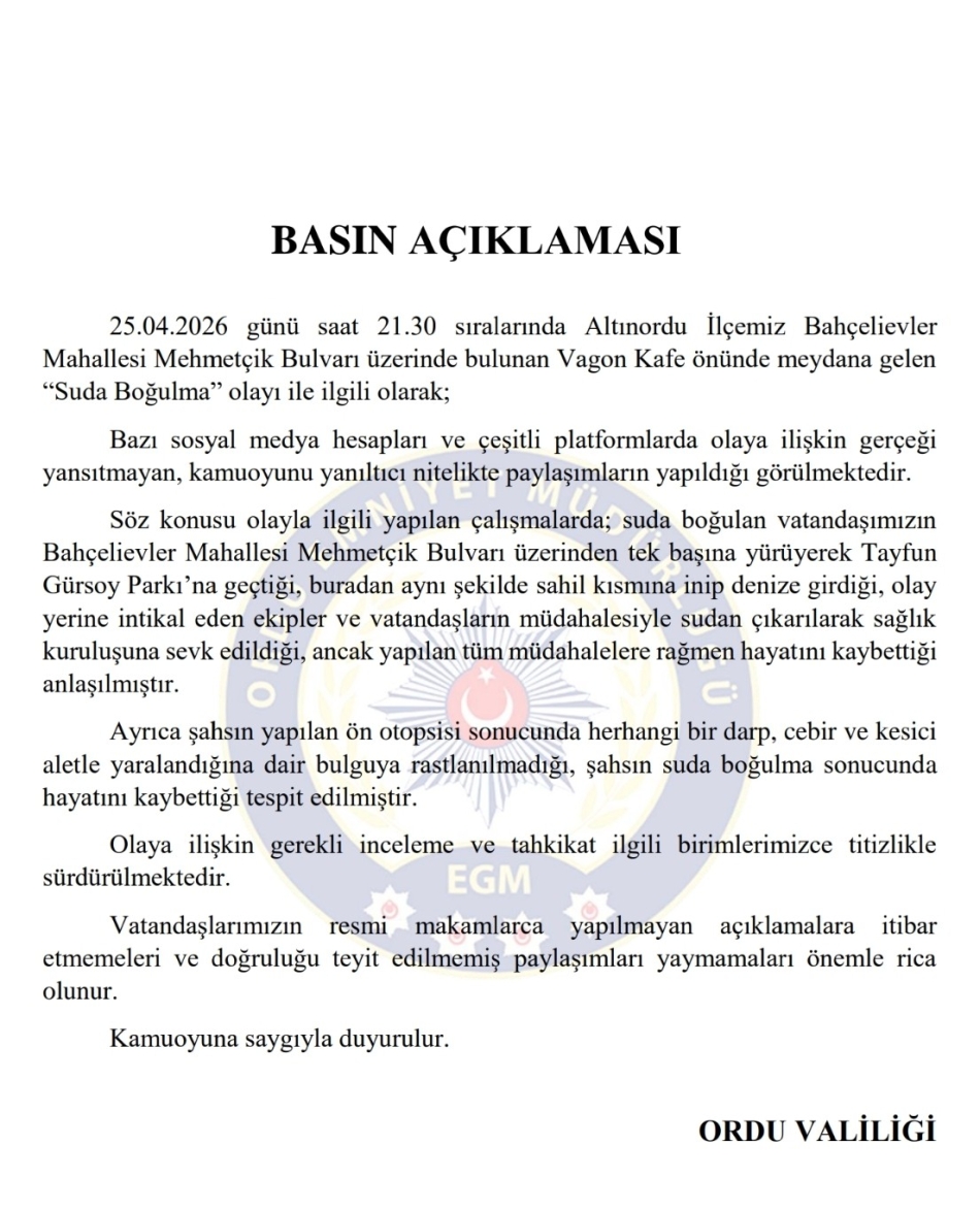 Valilikten yapılan açıklamada; 25.04.2026 günü saat 21.30 sıralarında Altınordu İlçemiz Bahçelievler Mahallesi Mehmetçik Bulvarı üzerinde bulunan Vagon Kafe önünde meydana gelen “Suda Boğulma” olayı ile ilgili olarak; Bazı sosyal medya hesapları ve çeşitli platformlarda olaya ilişkin gerçeği yansıtmayan, kamuoyunu yanıltıcı nitelikte paylaşımların yapıldığı görülmektedir.” İfadelerine yer verildi.