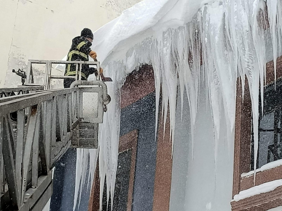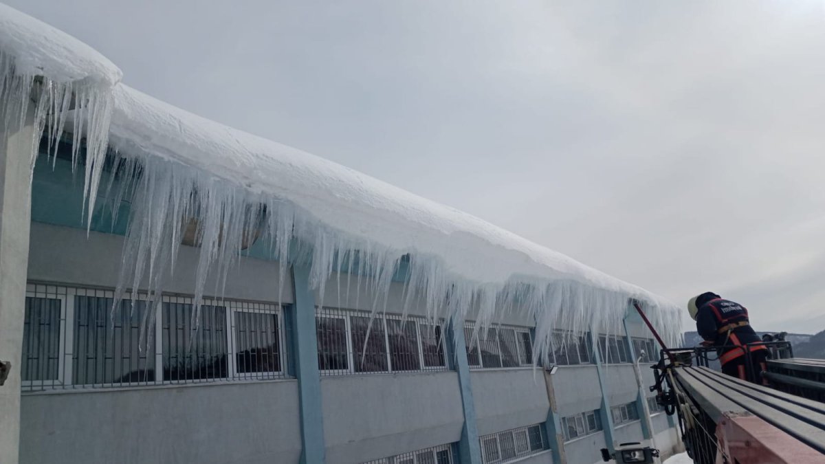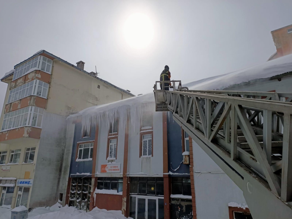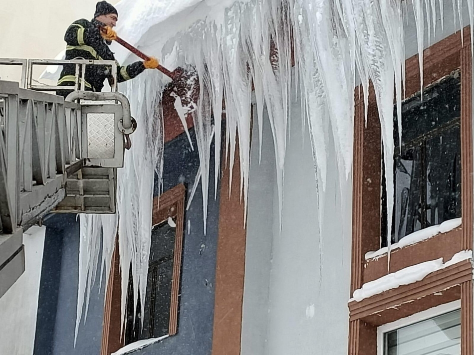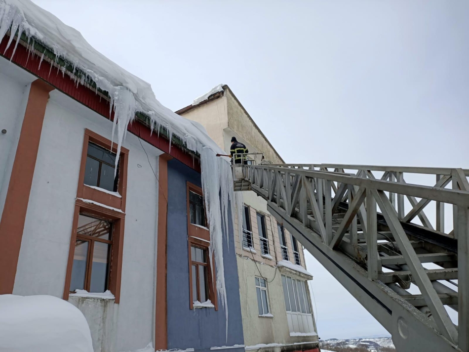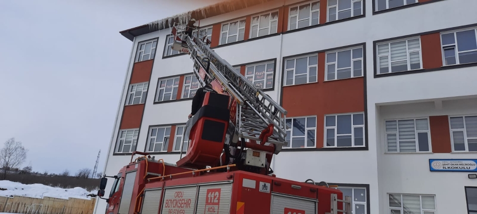 Ordu Büyükşehir Belediyesi itfaiye Dairesi Başkanlığı ekipleri, kar yağışı sonrası binalarda oluşan buz sarkıtlarını temizlemek için yoğun çalışma yürütüyor.