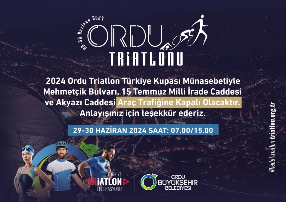 Türkiye Triatlon Federasyonu iş birliğinde gerçekleştirilen, Triatlon sporunun Ordu’da ve ülke genelinde geniş kitlelere ulaşmasını amaçlayan ve bu kapsamda 4 yıldır düzenlediği organizasyonlarla triatletleri şehirde ağırlayan Büyükşehir Belediyesi, “2024 Ordu Triatlon Türkiye Kupası” yarışlarına ev sahipliği yapacak.
