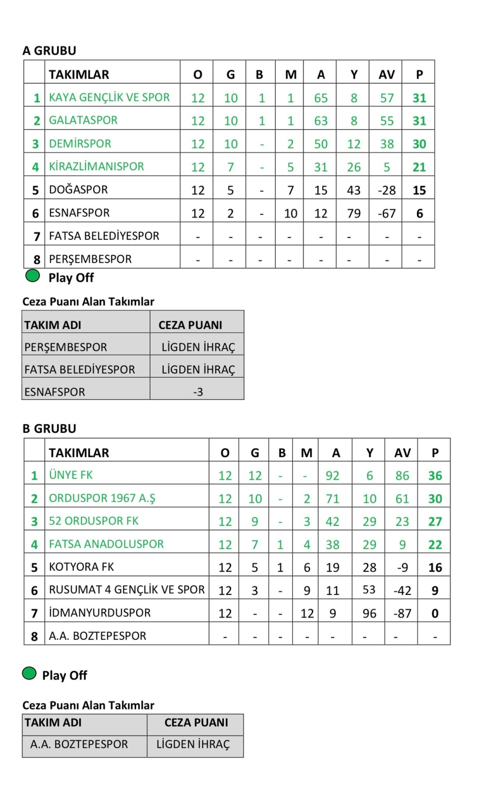 U15 liginin 12. Haftasında alınan toplu sonuçlar ve puan durumu şu şekilde oluştu;