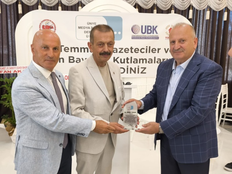 Programın devamında, gazetecilik mesleğine uzun yıllar emek veren isimlere plaket takdimi gerçekleştirildi. Bu kapsamda, Ünye’de gazeteciliğe uzun yıllar hizmet eden Gazeteci İrfan Tosun, mesleki katkıları nedeniyle plaketle onurlandırıldı.