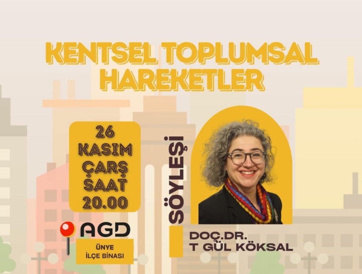 Doç.Dr. T. Gül Köksal 26.11.2025 Çarşamba 20.00’da Ünye AGD binasında “Kentsel Toplumsal Hareketler” konulu söyleşi gerçekleştirecek.