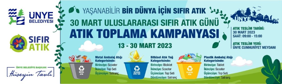 30 Mart Sıfır Atık Haftası dolayısıyla Ünye Belediyesi “Atık Toplama” kampanyası başlattı. Kampanya kapsamında 13-30 Mart tarihleri arasında atık toplama etkinliği yapılacak. 30 Mart tarihinde ise Ünye Cumhuriyet Meydanı’nda gerçekleştirilecek programla dereceye giren vatandaşlara çeşitli hediyeler verilecek.
