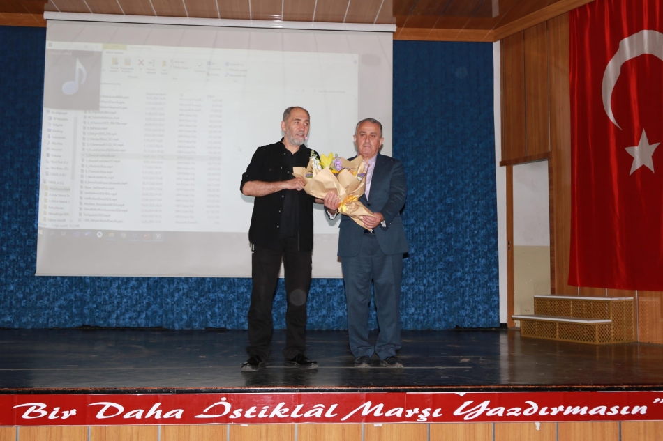 Söyleşi sonrası Ünye Belediye Başkan Yardımcısı Orhan Gürel Sula’ya çiçek takdim ederken Ünye Kaymakamlığı adına Ünye Milli Eğitim Şube Müdürü Telat Aktaş plaket takdim etti.