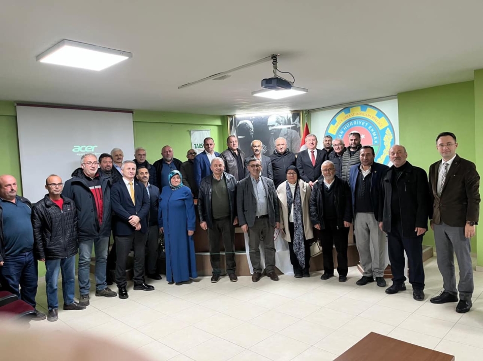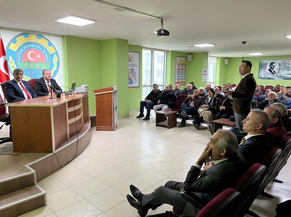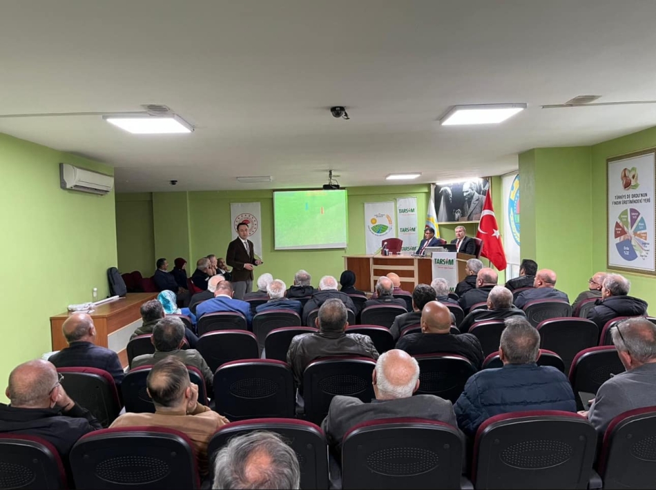Devlet Destekli Tarım Sigortaları tanıtım ve bilgilendirme toplantısında Tarsim Bölge Müdürü Bülent Yaşaroğlu ve Bölge Müdür Yardımcısı Burhan Kılıç, çiftçilere Tarım sigortaları havuzu 2025 yılı uygulamaları, bitkisel ürün ve hayvan hayat sigortaları hakkında bilgilendirmede bulundu.